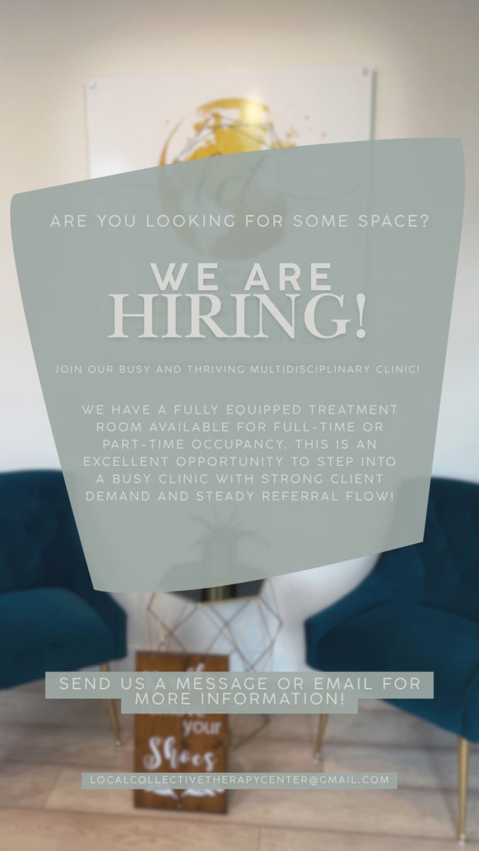 If you would like to discuss stepping into a fully booked schedule right off the bat, please contact Alisha at localcollectivetherapycente